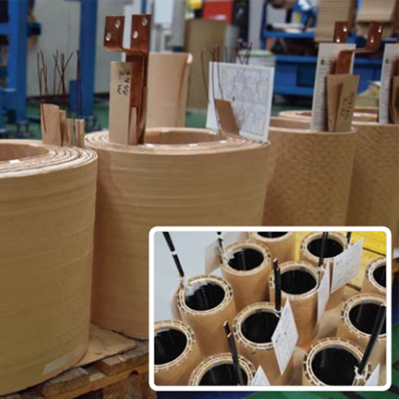In distribution and power transformers, windings are made of two components conductor and the insulation materials both provide maximum strength to axial and radial forces and increases the resistance of the winding against overvoltage impulses. LV (low voltage) windings are generally from a foil or paper insulated flat conductor. HV (high voltage) windings are however an enamel insulated round wire conductor or a paper insulated round or flat conductor. Copper or Aluminium conductor is used in the transformer windings. Whether the conductive material is copper, or aluminium varies accordingly to the current, voltage, specifications of the respective country and customer requirements. In between the layers of a coil, a special insulating material with increased insulation and high oil absorption is used, such as a craft paper, shellac paper (DDP, DPP) roll pressboards, etc. and this method provides gap-free, solid, coils with excellent properties. All components of insulation are made from electrical grade insulating board; processed to ensure electrical and mechanical stability throughout the temperatures found in operational service. High technology with modern winding machines and manufacturing with qualified technicians ensure that each winding is able to withstand the excessive axial forces, which may result from external sources.