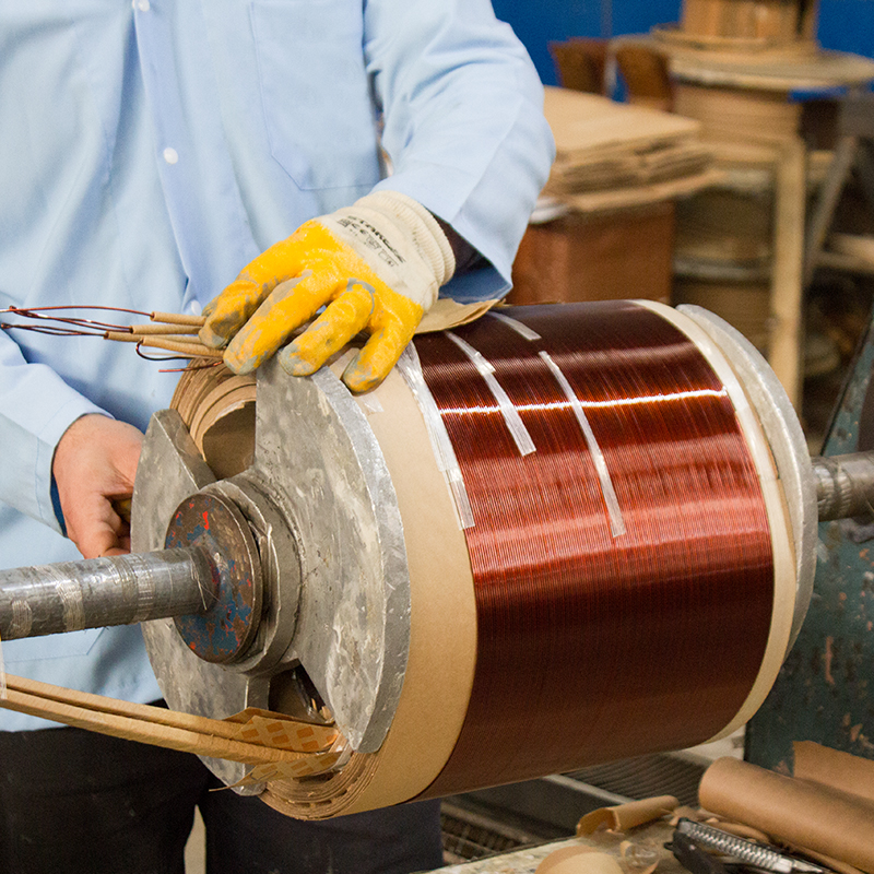 Dağıtım ve güç transformatörlerinde sargılar iki bileşenli iletkenden yapılır ve yalıtım malzemeleri eksenel ve radyal kuvvetlere maksimum dayanım sağlar hem de sargının aşırı gerilim darbelerine karşı direncini arttırır. AG (düşük voltaj) sargıları genellikle folyo veya kağıt yalıtımlı düz iletkenden yapılır. Ancak HV (yüksek voltaj) sargıları, emaye yalıtımlı yuvarlak tel iletken veya kağıt yalıtımlı yuvarlak veya düz iletkendir. Trafo sargılarında bakır veya alüminyum iletken kullanılmaktadır. İletken malzemenin bakır mı yoksa alüminyum mu olduğu, ilgili ülkenin akım, voltaj, özelliklerine ve müşteri gereksinimlerine göre değişir. Bir bobinin katmanları arasında, kraft kağıdı, gomalak kağıdı (DDP, DPP) rulo pres tahtaları vb. gibi yalıtımı artırılmış ve yüksek yağ emilimi olan özel bir yalıtım malzemesi kullanılır ve bu yöntem boşluksuz, sağlam, mükemmel özelliklere sahip bobinlerdir. Yalıtımın tüm bileşenleri, elektrik sınıfı yalıtım levhasından yapılmıştır; operasyonel hizmette bulunan sıcaklıklar boyunca elektriksel ve mekanik stabiliteyi sağlamak için işlenir. Modern sarım makineleri ile yüksek teknoloji ve kalifiye teknisyenler ile üretim, her sarımın dış kaynaklardan kaynaklanabilecek aşırı eksenel kuvvetlere dayanabilmesini sağlar.